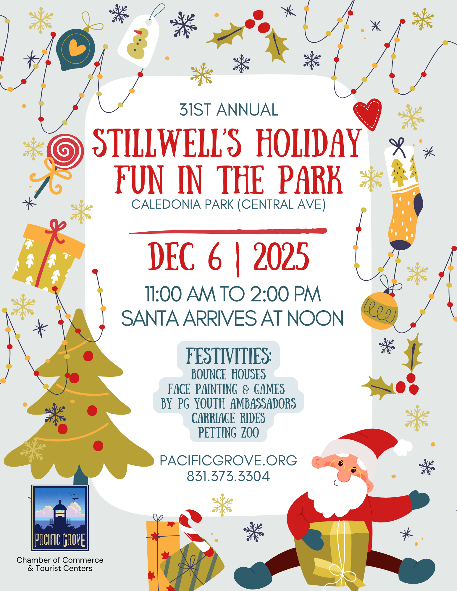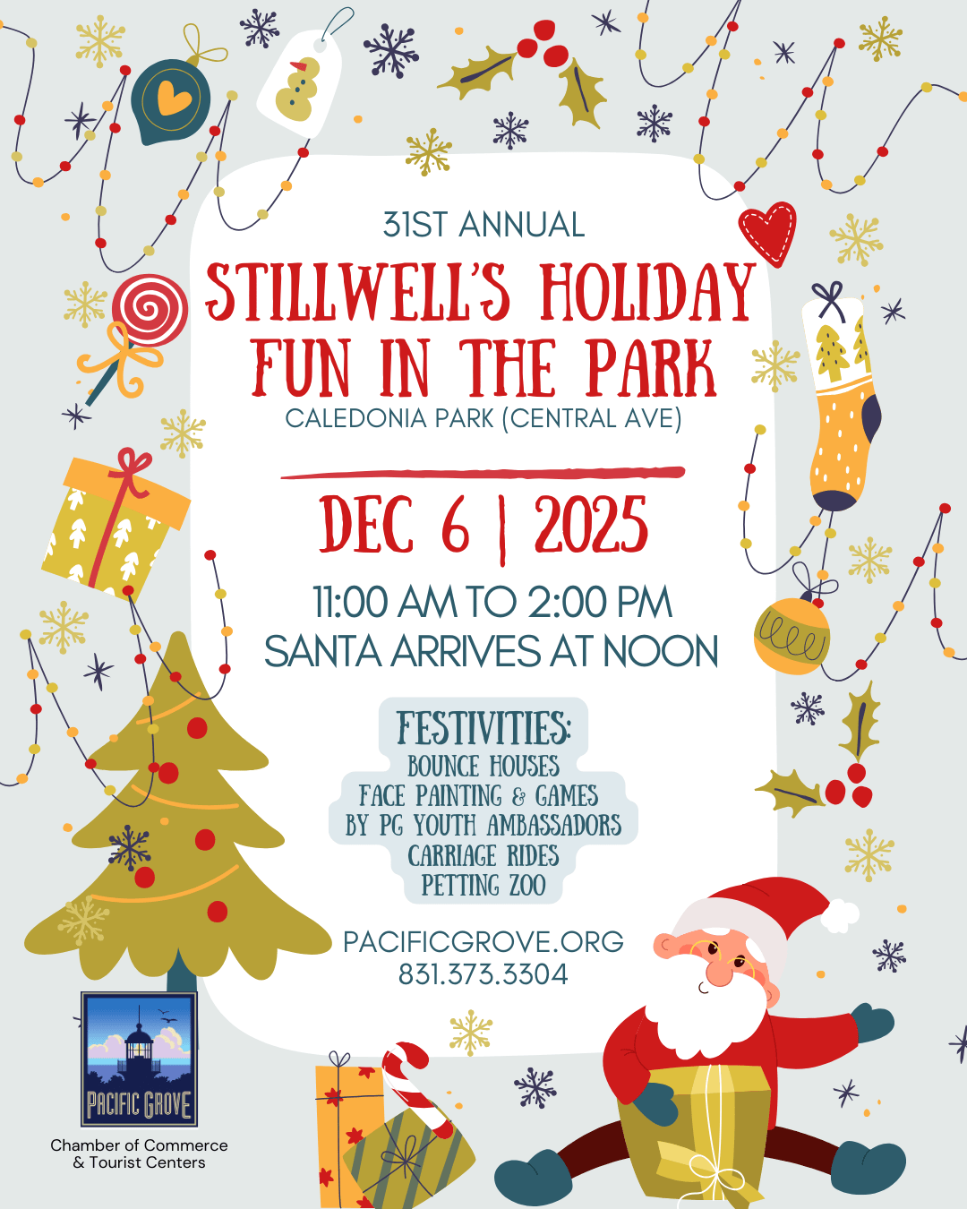 Join us for Stillwell's Holiday Fun in the Park on Saturday, December 6th from 11:00 am - 2:00 pm at Caledonia Park. Festivities include Bounce Houses, Face Painting & Games by the Youth Ambassadors of Pacific Grove, Carriage Rides and Petting Zoo and much more. Santa Claus arrives at 12:00 pm!Images