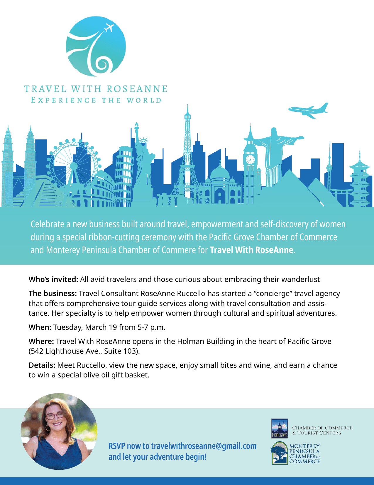 Celebrate, Travel with RoseAnne, a new business built around travel, empowerment and self-discovery of women during a special ribbon-cutting ceremony on Tuesday, March 19th from 5:00 - 7:00 pm. Meet RoseAnne, view the new space, enjoy small bites and wine, and earn a chance to win a special olive oil gift basket.