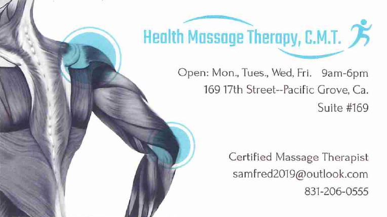 Health Massage Therapy, CMT Back to Search Health Massage Therapy, CMT Categories Massage Therapy Health & Wellness Holistic Health & Wellness 169 17th Street, Suite 169 , Pacific Grove , CA , 93950 (831) 206-0555 Send Email About Share × Print Email Facebook LinkedIn X Pinterest Powered By GrowthZone