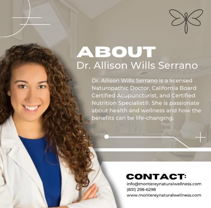Dr. Allison Serrano, a licensed Naturopathic Doctor and Board Certified Acupuncturist, is passionate about health and wellness and how the benefits can be life-changing. She dedicated years to studying various healing arts to best help her patients. She holds three degrees and multiple certifications in the health field. Her unique educational background and licenses in several areas of functional medicine enable her to combine Western and Eastern Medicine to create a truly integrative patient experience.