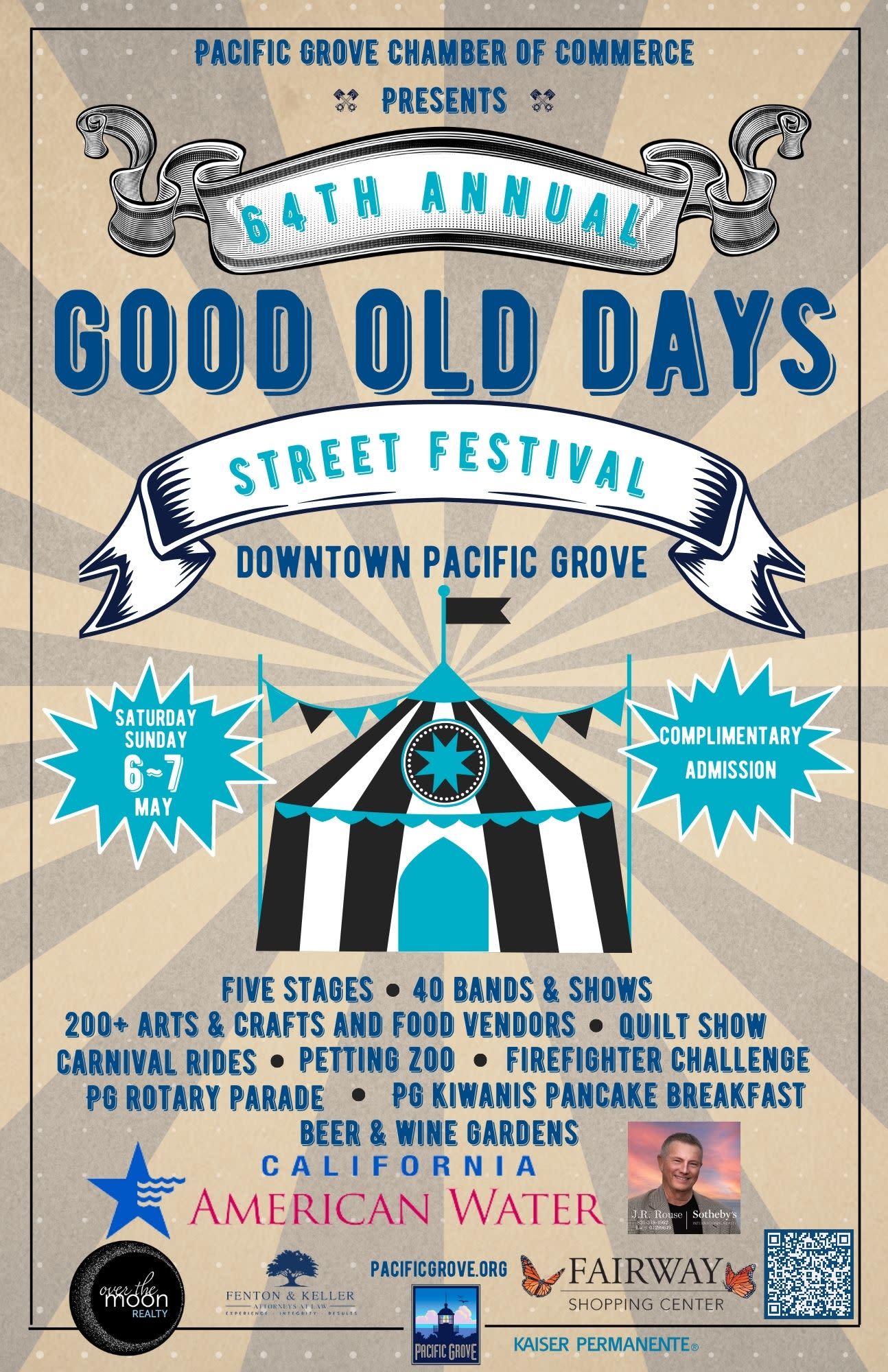 64th Annual Good Old Days Street Festival is Pacific Grove’s premier community event and is returning to downtown Pacific Grove the first weekend of May! Each year this FREE event draws a great crowd of locals and visitors, rain or shine! Vendors from multiple states display their arts and crafts alongside a wide variety of food booths stretched down historic Lighthouse Avenue, the largest gathering of arts and crafts vendors in Monterey County.