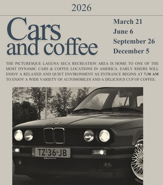 The picturesque Laguna Seca Recreation Area is home to one of the most dynamic Cars & Coffee locations in America. Early risers will enjoy a relaxed and quiet environment as entrance begins at 7:30 am to enjoy a wide variety of automobiles and a delicious cup of coffee. A $5 donation is required which will go to Friends of Laguna Seca, the 501c (3) non-profit that is investing in the revitalization of the raceway. In addition to coffee, track gear from the Official Raceway Store and season ticket promotions will be available!