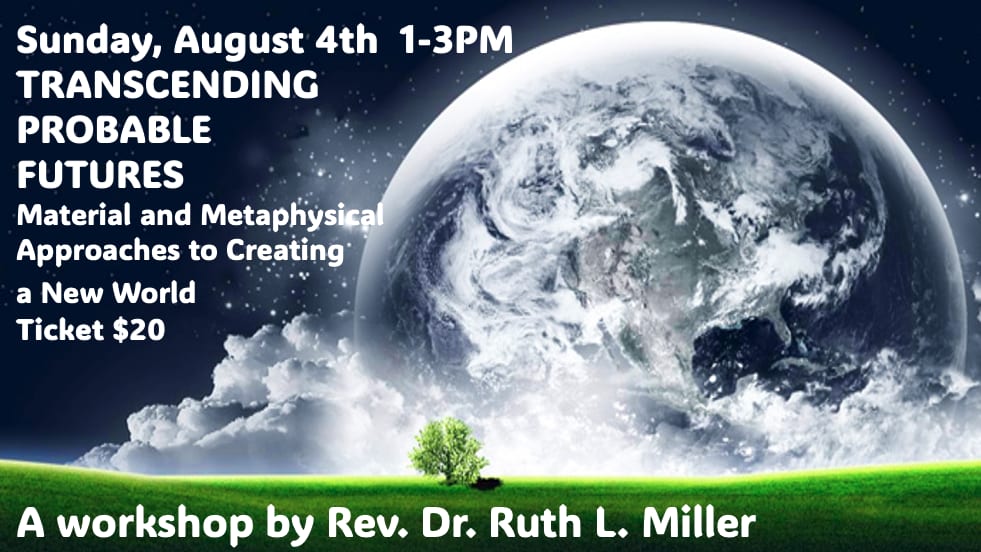 Join Rev. Dr. Ruth Miller as she will present "Transcending probable Futures" on Sunday August 4th from 1:00 – 4:00 pm. The media has kept us focused on fear, but there is much good happening in the world that is leading us to a new culture and more heavenly life. Rev. Dr. Ruth L. Miller brings us up to date on some current trends and helps us see how our state of consciousness is helping bring about a transformation in human experience.