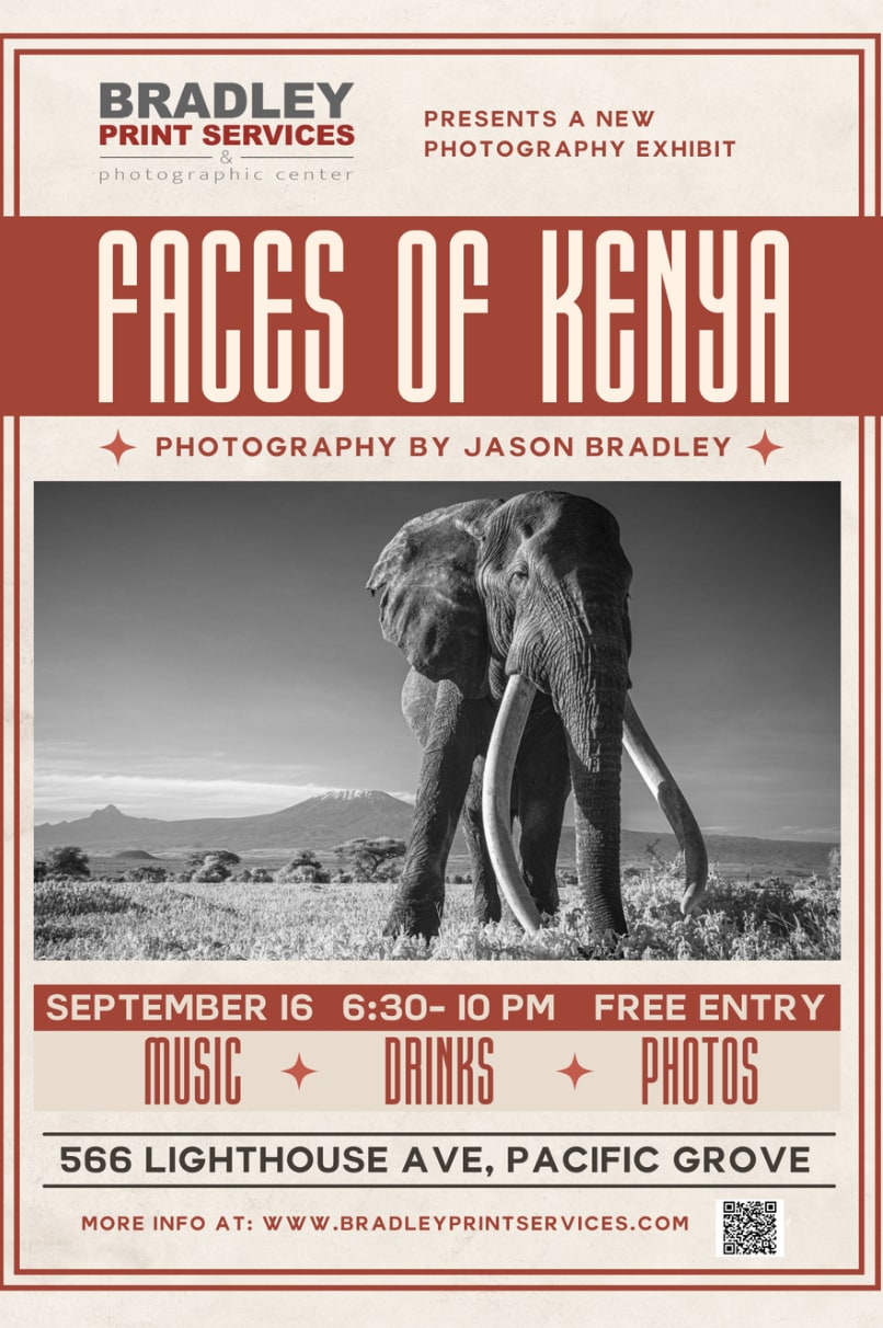 Bradley Print Services & Photographic Center is delighted to announce a unique philanthropic art experience: the opening of "Faces of Kenya," photographed and curated by the center’s owner, Jason Bradley. Set to kick off on September 16th at 6:30 pm at 566 Lighthouse Avenue in Downtown Pacific Grove, this free event is more than just a visual feast—it's a chance to make a difference. Live music, delicious food, and drinks will complement the evening's festivities. All are warmly invited to attend. The Cause: The Kilgoris Project A portion of the exhibit's proceeds will go to The Kilgoris Project, a remarkable organization committed to building schools and offering a holistic range of services—like clean water, food, and medicine—in Kenya. Jason Bradley’s first visit to Kenya involved accompanying The Kilgoris Project to document their humanitarian efforts. The experience left an indelible impression on him and ignited a lifelong love for Kenya's landscape, wildlife, and people. Your attendance is more than just an appreciation of art; it's an act of support for a noble cause. Join us for an unforgettable evening that promises an enriching blend of art, culture, community, and philanthropy.
