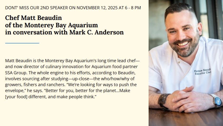 Tonight, Chef Matt Beaudin of the Monterey Bay Aquarium in conversation with Mark C. Anderson