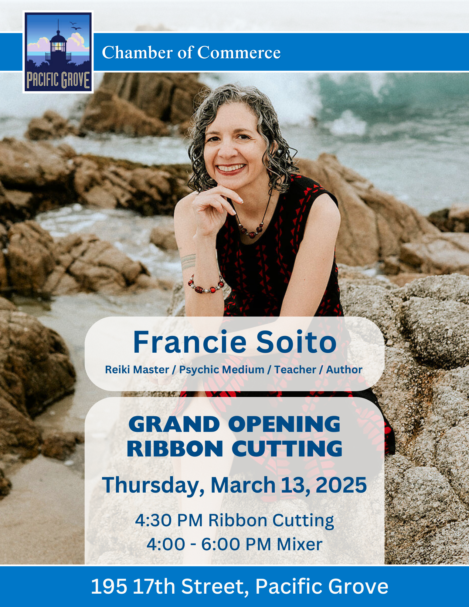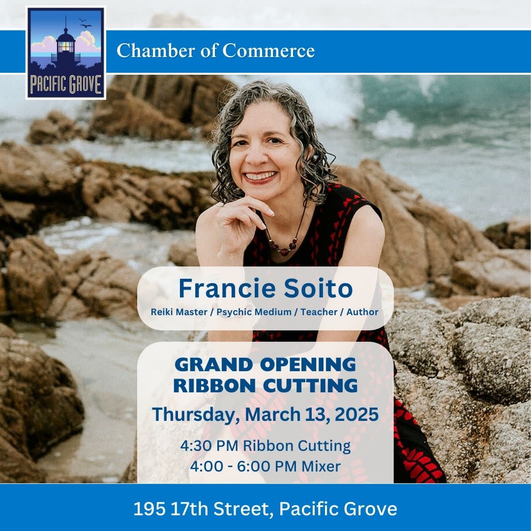 Join the Pacific Grove Chamber of Commerce for the Grand Opening Ribbon Cutting for Francie Soito – Reiki Master/Psychic Medium/Teacher/Author) @franciesoito.