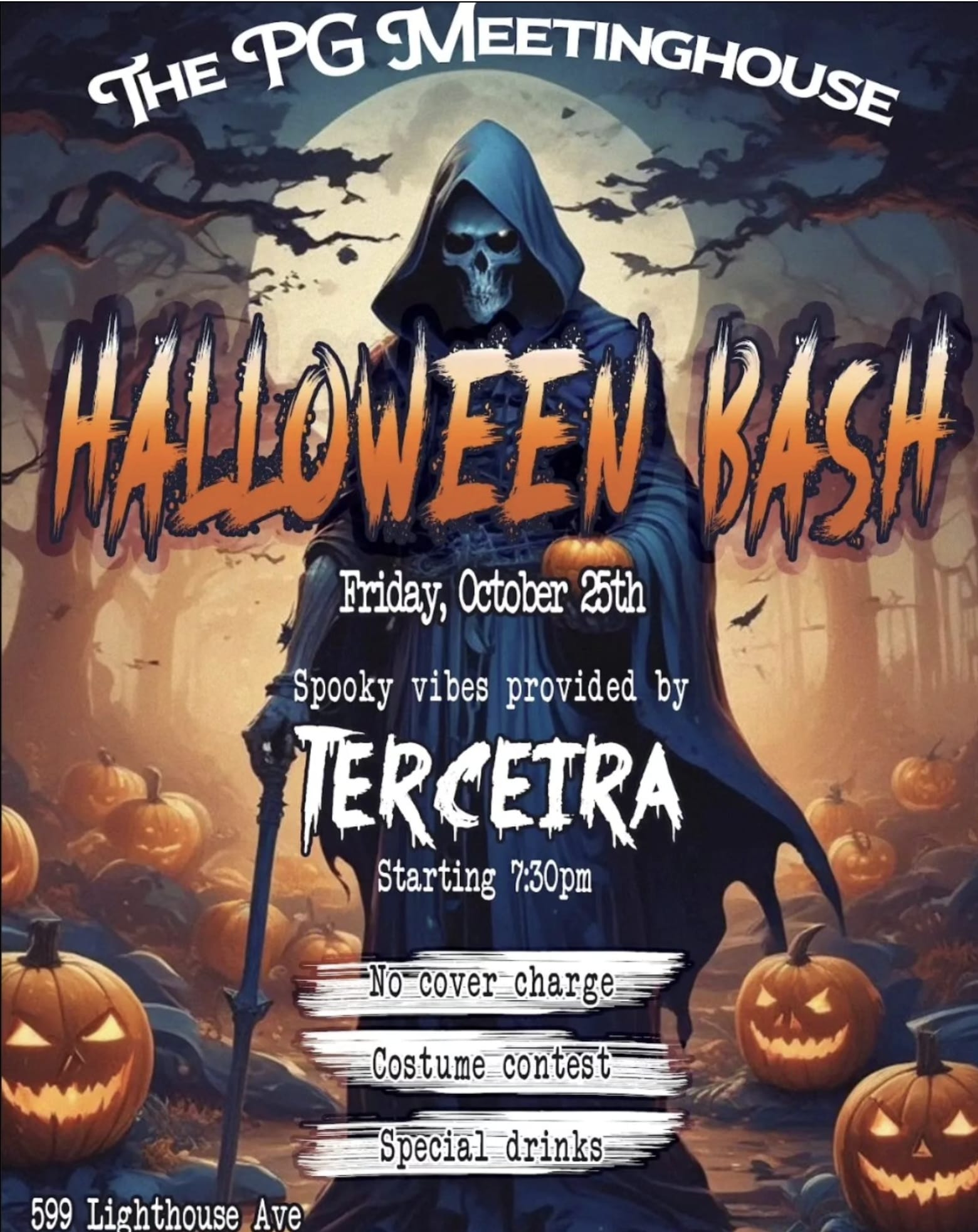 The PG Meetinghouse is having a Halloween Bash! Friday, October 25th at 7:30 pm.