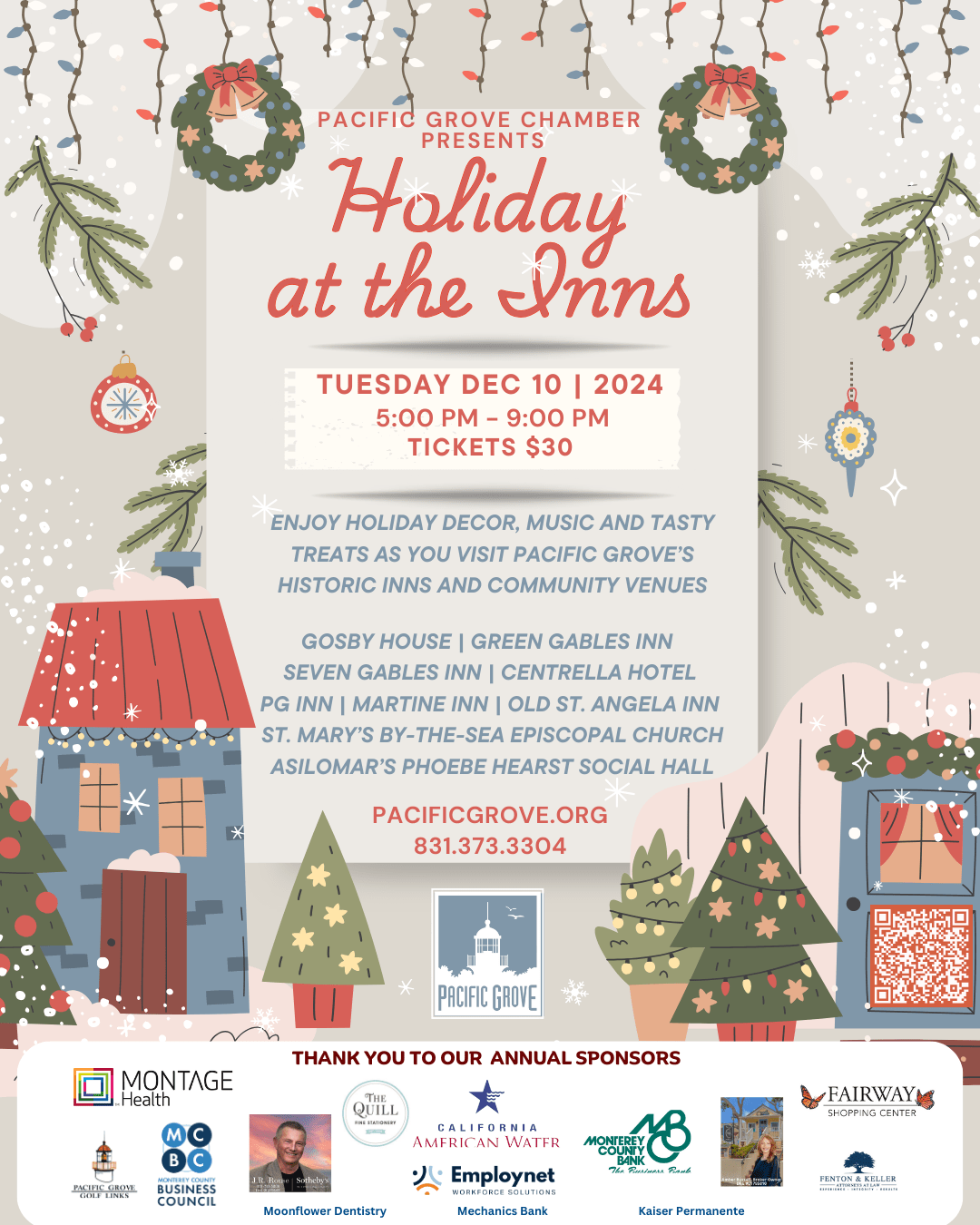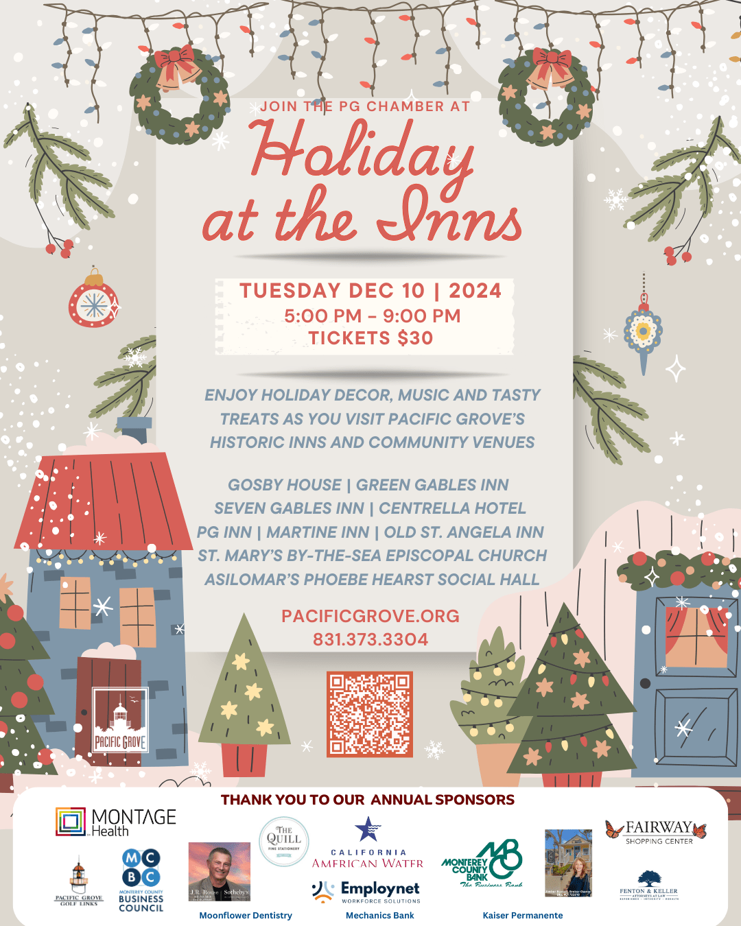 Experience the magic of the holidays and a festive walking tour of the historic Inns, Asilomar Conference Grounds and St. Mary’s by-the-Sea Episcopal Church of Pacific Grove.