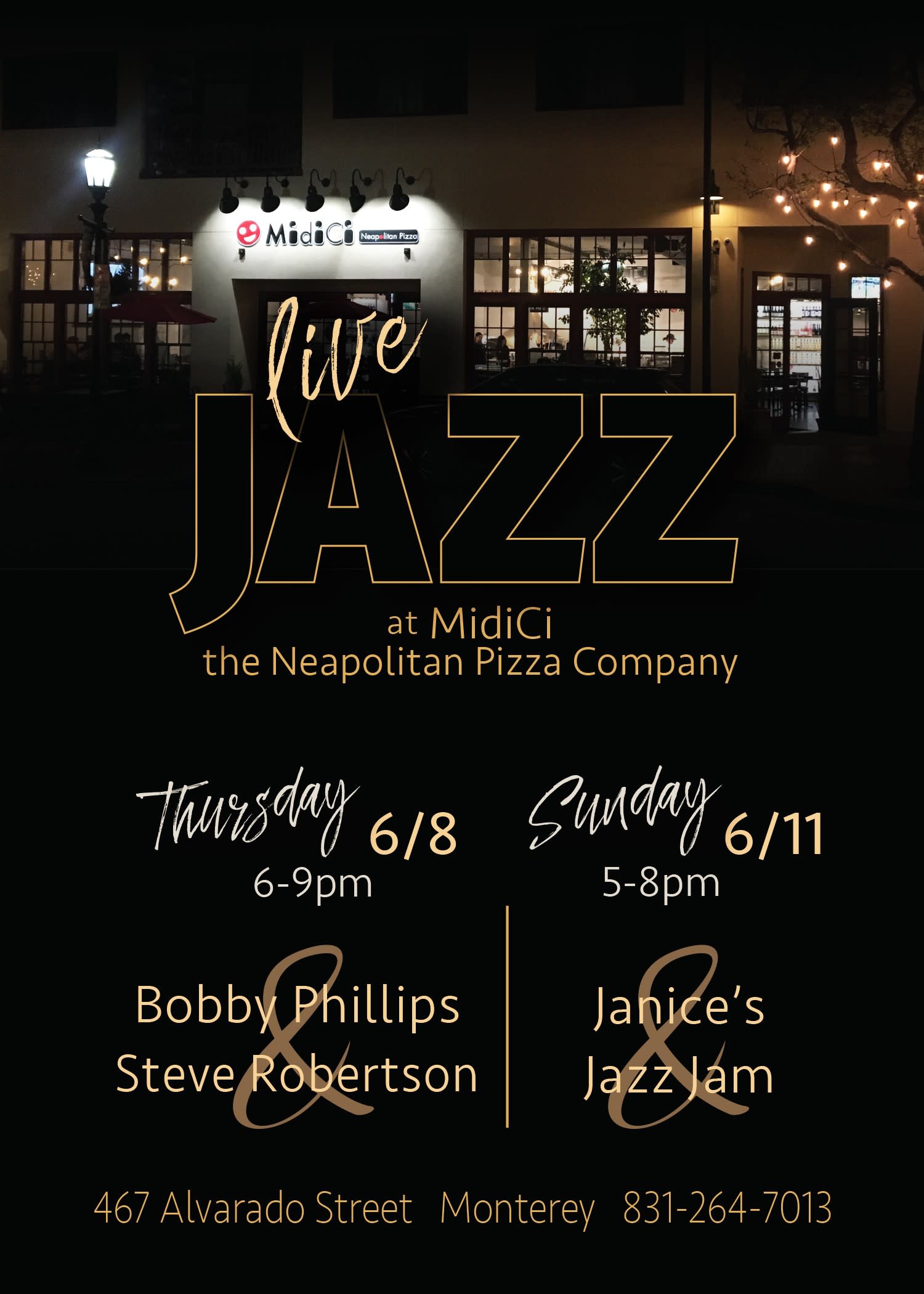 Live Jazz at MidiCi - Thursday, June 8th from 6:00 - 9:00 pm. Enjoy the sounds of Bobby Phillips and Steve Robertson. MidiCi Jazz