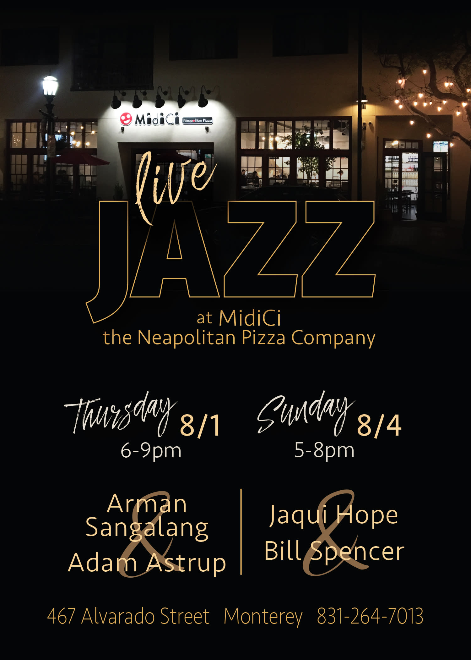 Savor the sounds of live music and rich tastes of Italy at MidiCi Monterey! Be our guest at Jazz Night this Sunday August 4th from 5:00 – 8:00 pm with Jaqui Hope and Bill Spencer! For more information: MidiCiImages