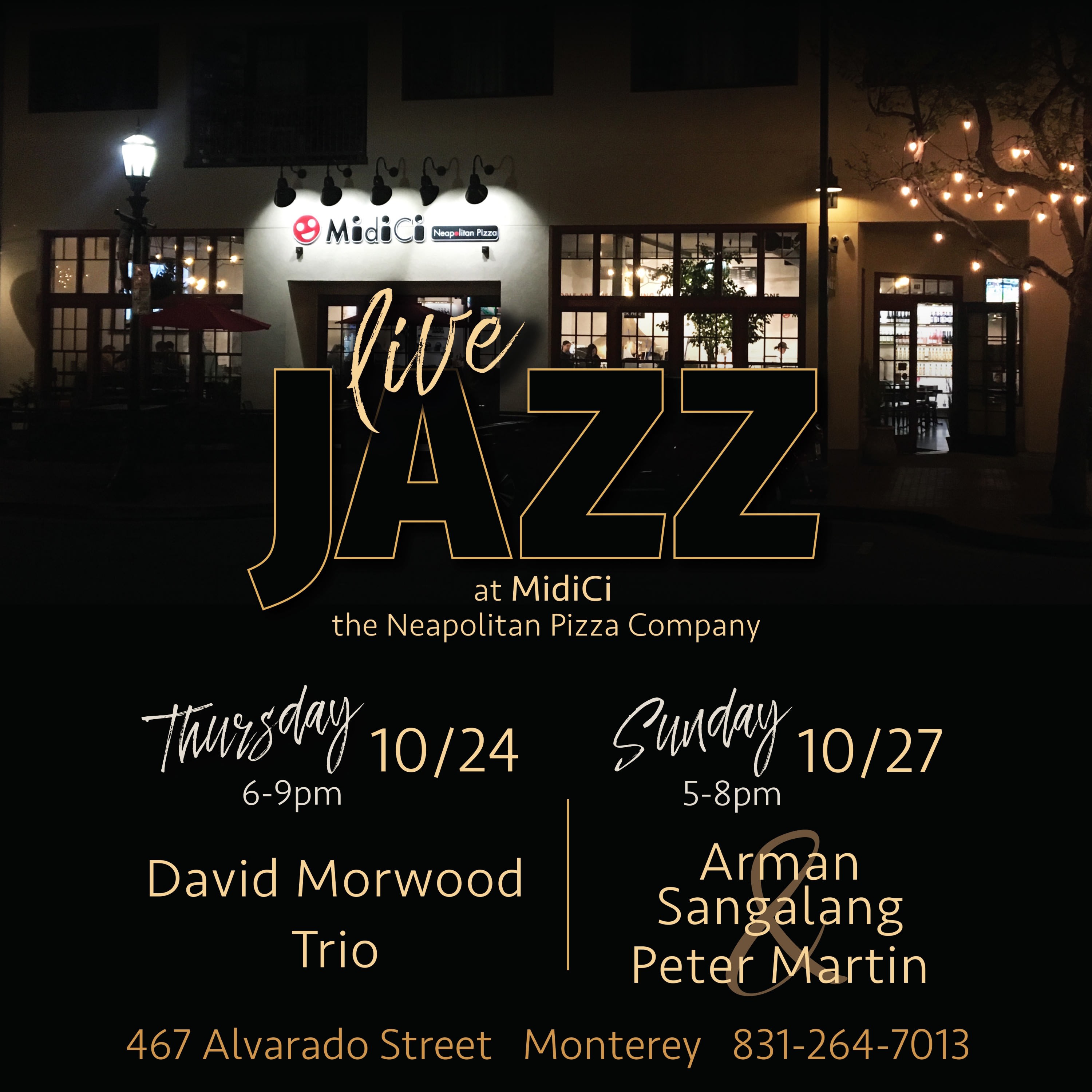 At MidiCi Monterey on Thursday, October 24th from 6:00 – 9:00 pm, dig into your favorite pizza while sipping on our ice-cold beers and listening to the sounds of the David Morwood Trio. Cheers to amazing music, food and incredible drinks! For more information: MidiCi