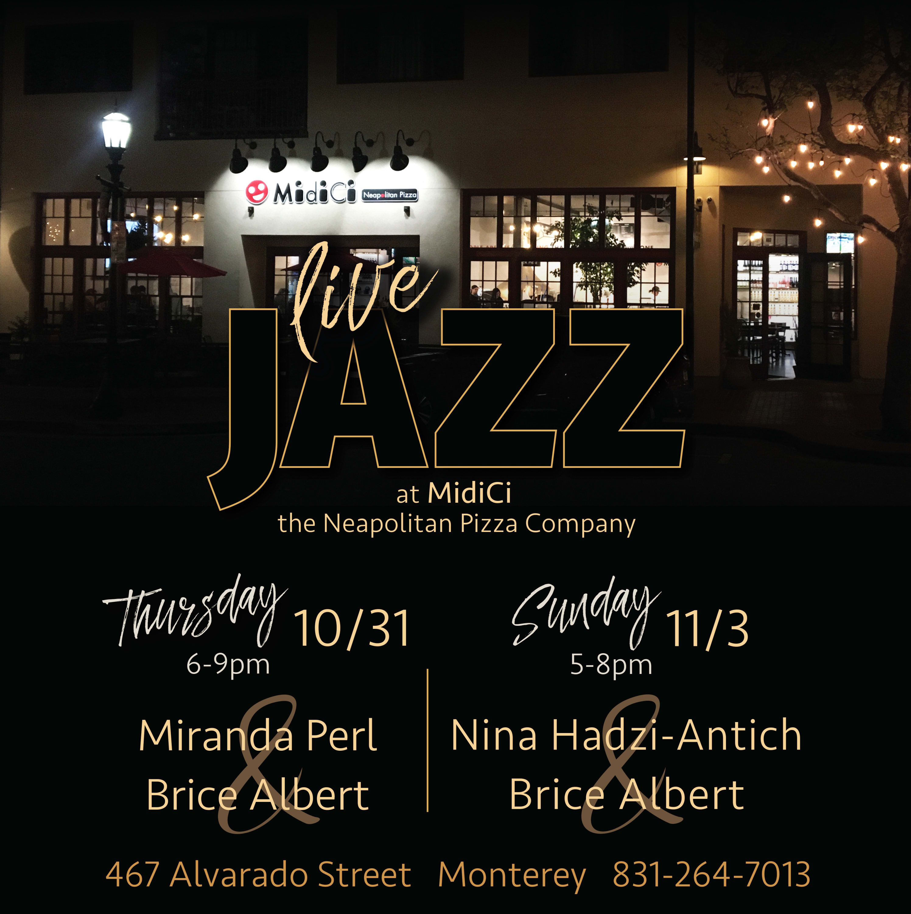Join MidiCi Monterey this Sunday, November 3rd, between 5:00 – 8:00 pm for Jazz Night – an unforgettable evening of smooth jazz with Nina Hadzi-Antich and Brice Albert, while enjoying delightful Italian dishes and drinks, and great company.