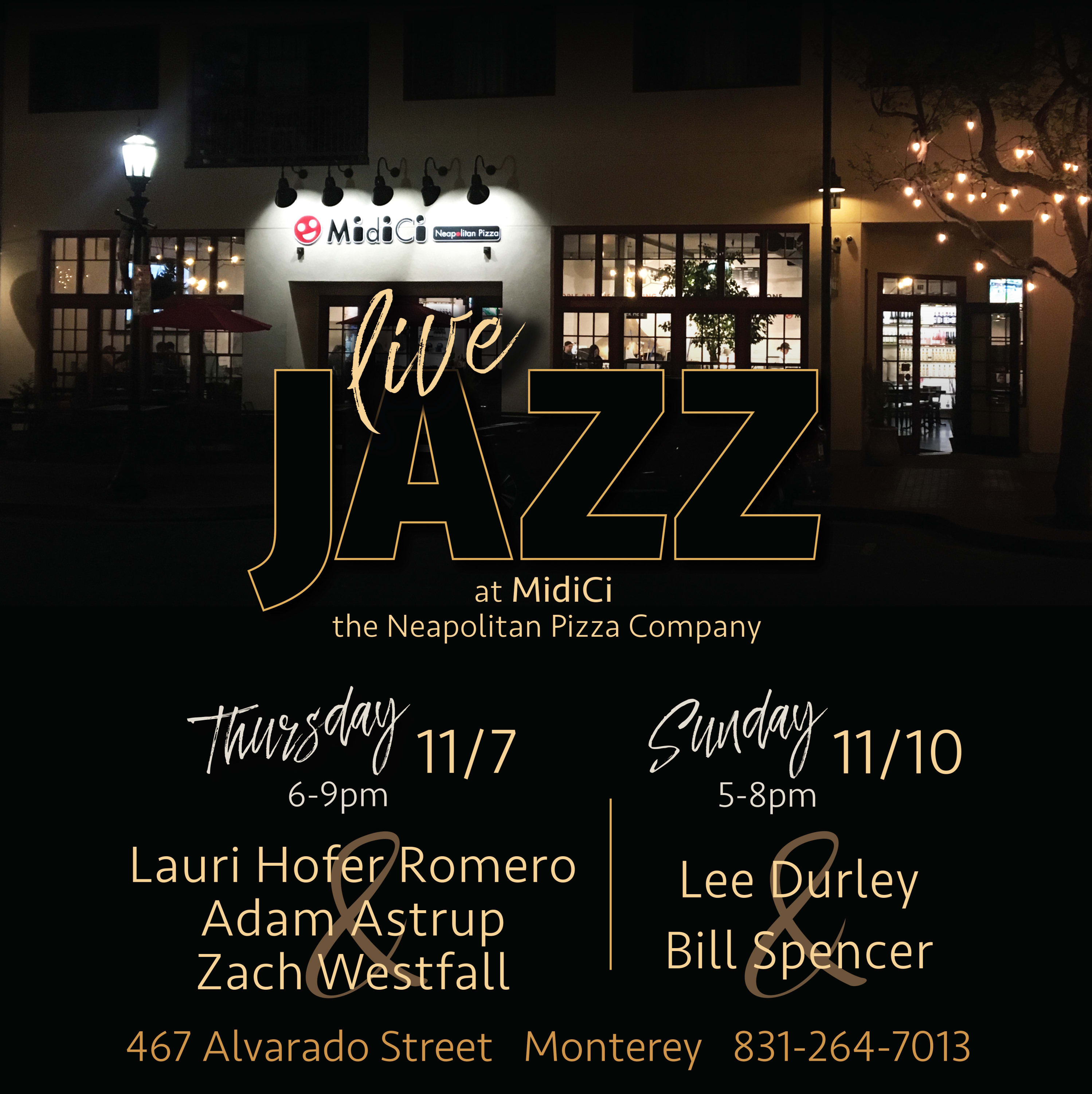 Find your flow and cut loose at MidiCi Monterey Jazz Night on Sunday, November 10th, from 5:00 – 8:00 pm with Lee Durley and Bill Spencer, so swing by 467 Alvarado for suave, live music & bold-flavored food and drinks.