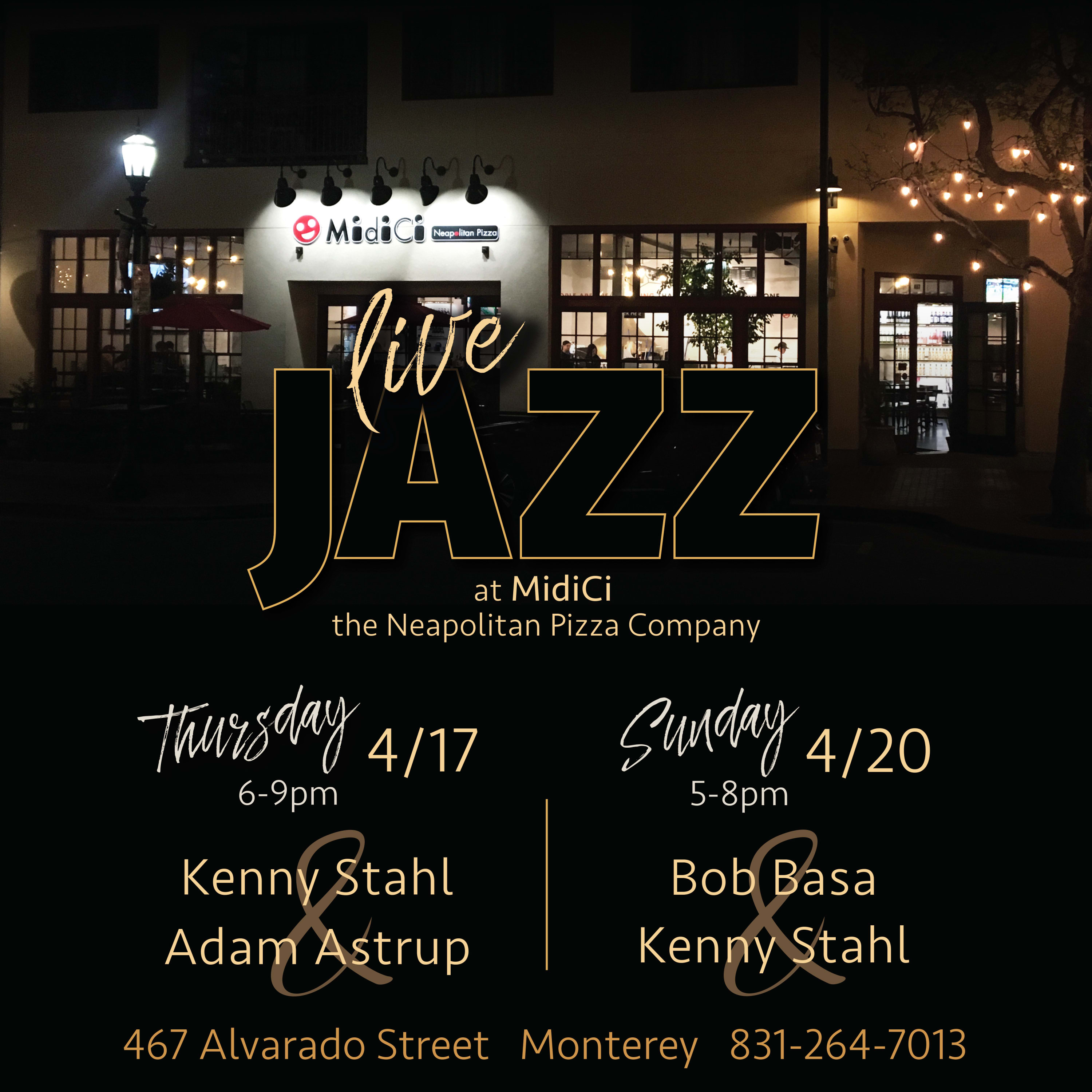 Live Music, Authentic Flavors, Great Company! Join us this Thursday from 6:00 – 9:00 pm for unforgettable Jazz with Kenny Stahl and Adam Astrup and great food and drink at MidiCi Monterey! For more information: MidiCi