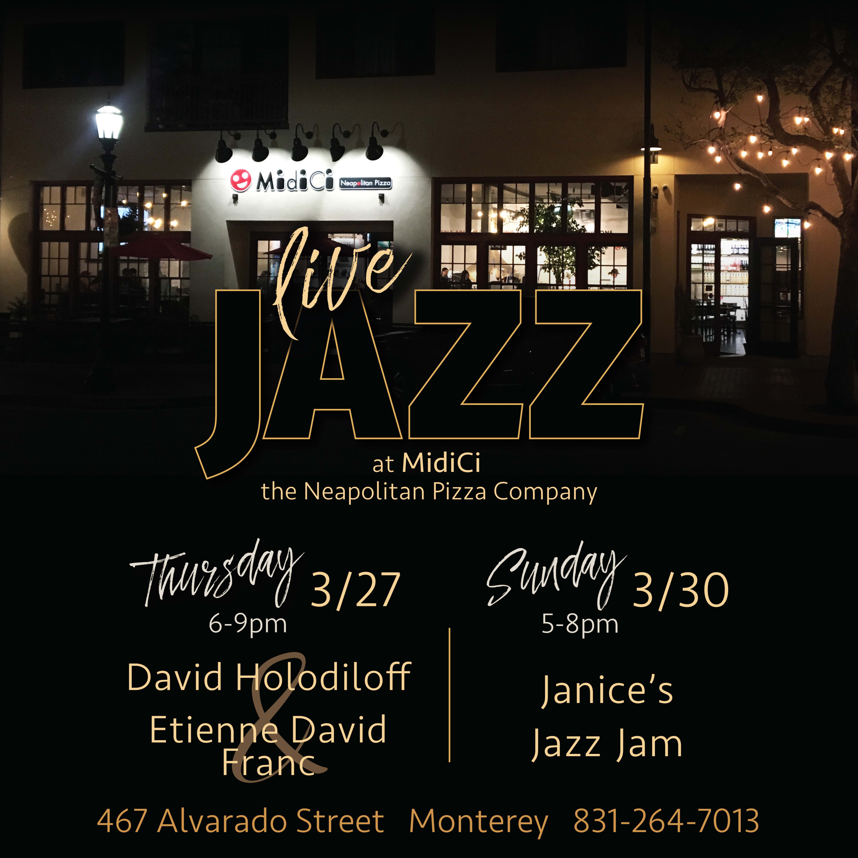 Because dinner tastes better with jazz. Head over to MidiCi Monterey this Thursday evening from 5:00 – 8:00 pm. Then grab a seat, order your favorites, and let the live music of David Holodiloff and Etienne David Franc take you away!