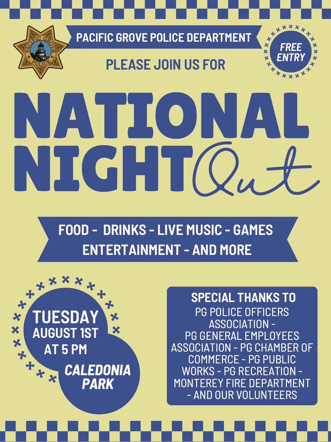 This is an annual community-building campaign that promotes police/community partnerships and neighborhood camaraderie. For more information: www.cityofpacificgrove.org