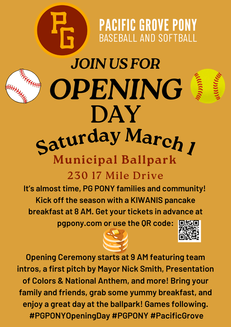 Join us for Opening Day, Saturday, March 1st at the Municipal Ballpark located at 230 17Mile Drive. Kick off the season with a Kiwanis Pancake breakfast at 8:00 am. Opening ceremony starts at 9:00 am featuring team intros, a first pitch by Mayor Nick Smith, Presentation of Colors & National Anthem, and more! For more information and tickets: PGPony