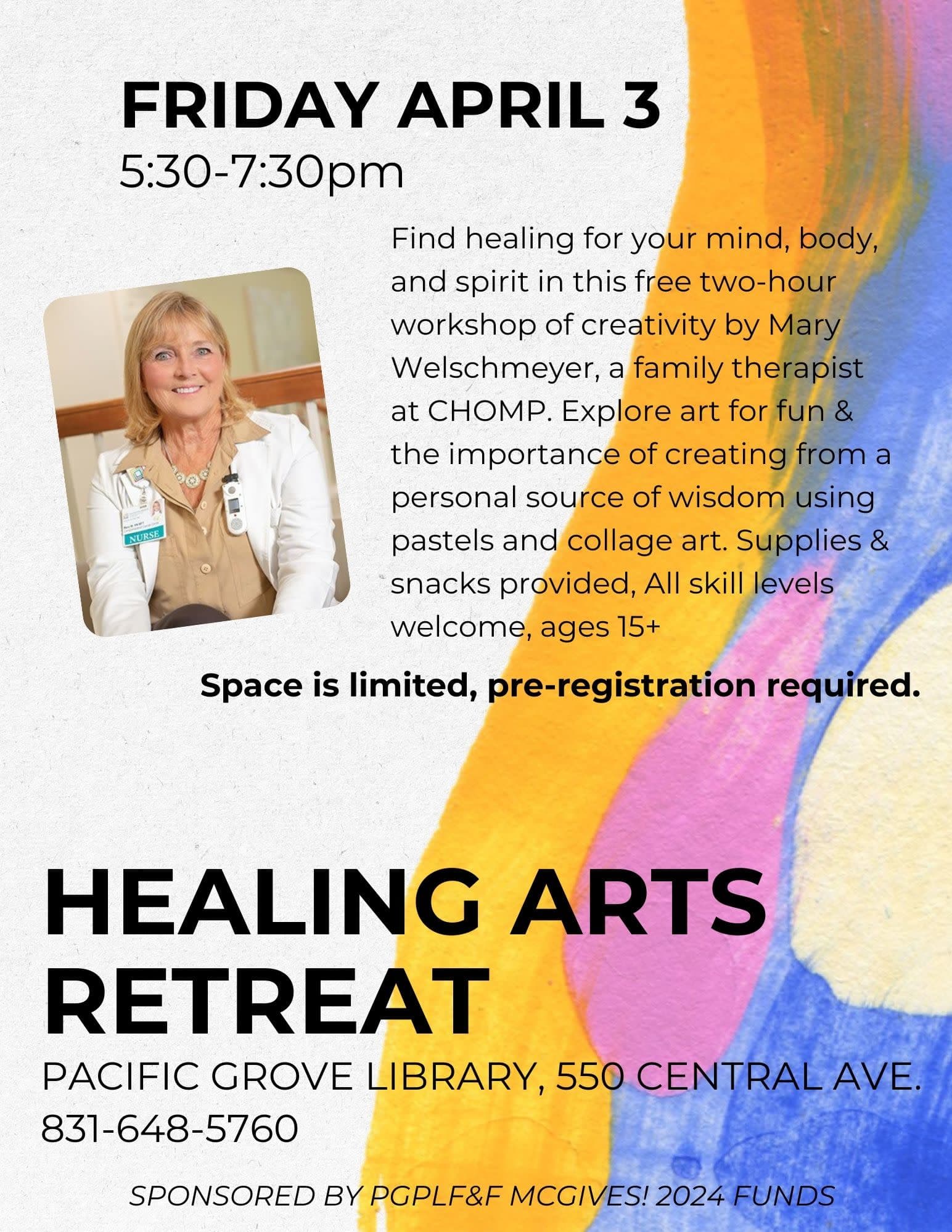 On Friday, April 3rd from 5:30 – 7:30 pm at the PG Library, find healing for your mind, body, and spirit in this free two-hour workshop of creativity by Mary Welschmeyer, a family therapist at CHOMP. Explore art for fun & the importance of creating from a personal source of wisdom using pastels and collage art. Supplies and snacks provided, all skill levels welcome, ages 15+. Space is limited, pre-registration required.