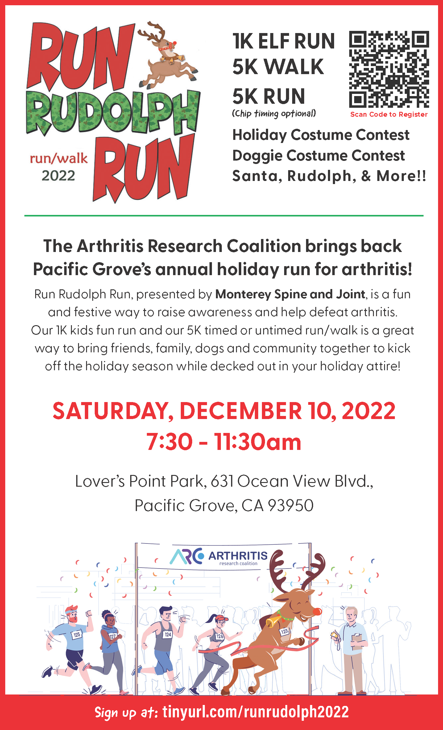 The Arthritis Research Coalition brings back Pacific Grove's Annual Run Rudolph Run/Walk! Celebrate the season of giving by participating in this community favorite charity race and help defeat arthritis in our lifetime.