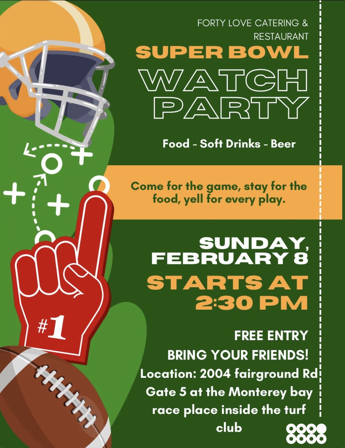 On Sunday, February 8th at 2:30 pm bring your friends to the Monterey County Fairgrounds at 2004 Fairgrounds Rd, Gate 5 at the Monterey Bay Race Place inside the turf club and watch the Superbowl. There will be food from Forty Love Catering, soft drinks and beer. Free Entry