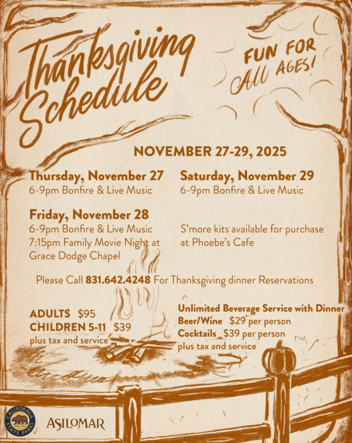 Prefer to celebrate just the big meal? You’re welcome to join us for a special Thanksgiving Dinner in our historic dining hall. Dinner Reservations: Call 831.642.4248 to reserve your table.