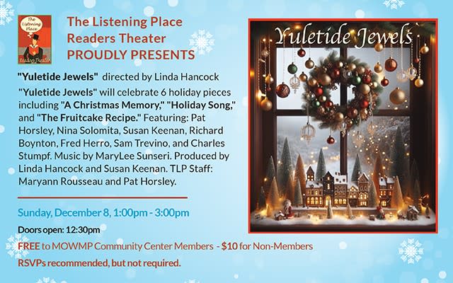 "Yuletide Jewels" will celebrate 6 holiday pieces including "A Christmas Memory," "Holiday Song," and "The Fruitcake Recipe" on Sunday, December 8, from 1:00 - 3:00 pm at the Meals On Wheels Community Center, 700 Jewell Ave, Pacific Grove. Free admission to members. Non-members $10 at the door. Doors open at 12:30PM. Call for reservations: (831) 373-4454