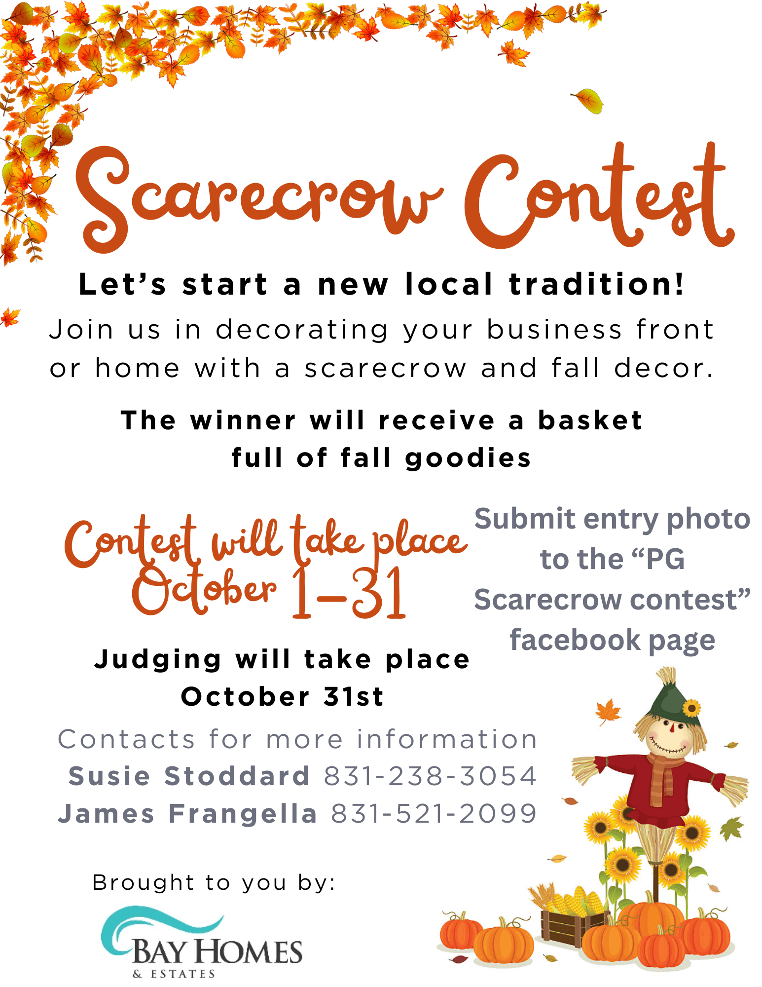 Join us in decorating your business front or home with a scarecrow and fall décor. Brought to you by Bay Homes & Estates. The Contest will take place Oct 1- 31 and judging will take place October 31st. Submit entry photo to the "PG Scarecrow Contest" Facebook page. Winner will receive a basket full of fall goodies! For more information call Susie at 831-238-3054 or James at 831-521-2099.