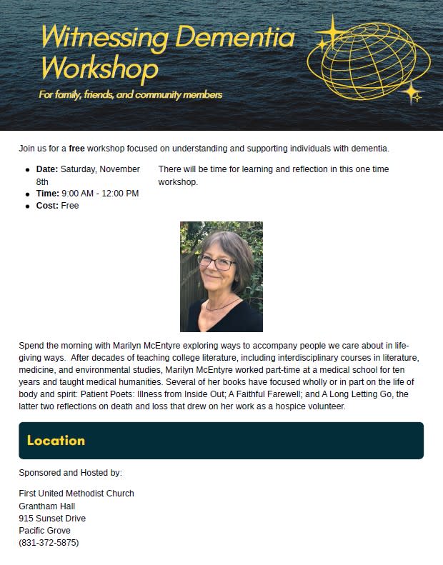 Join us on Saturday, November 8th from 9:00 am – 12:00 pm at the First United Methodist Church for a free workshop with Marilyn McEntyre focused on understanding and supporting individuals with dementia. For more information: FUMC