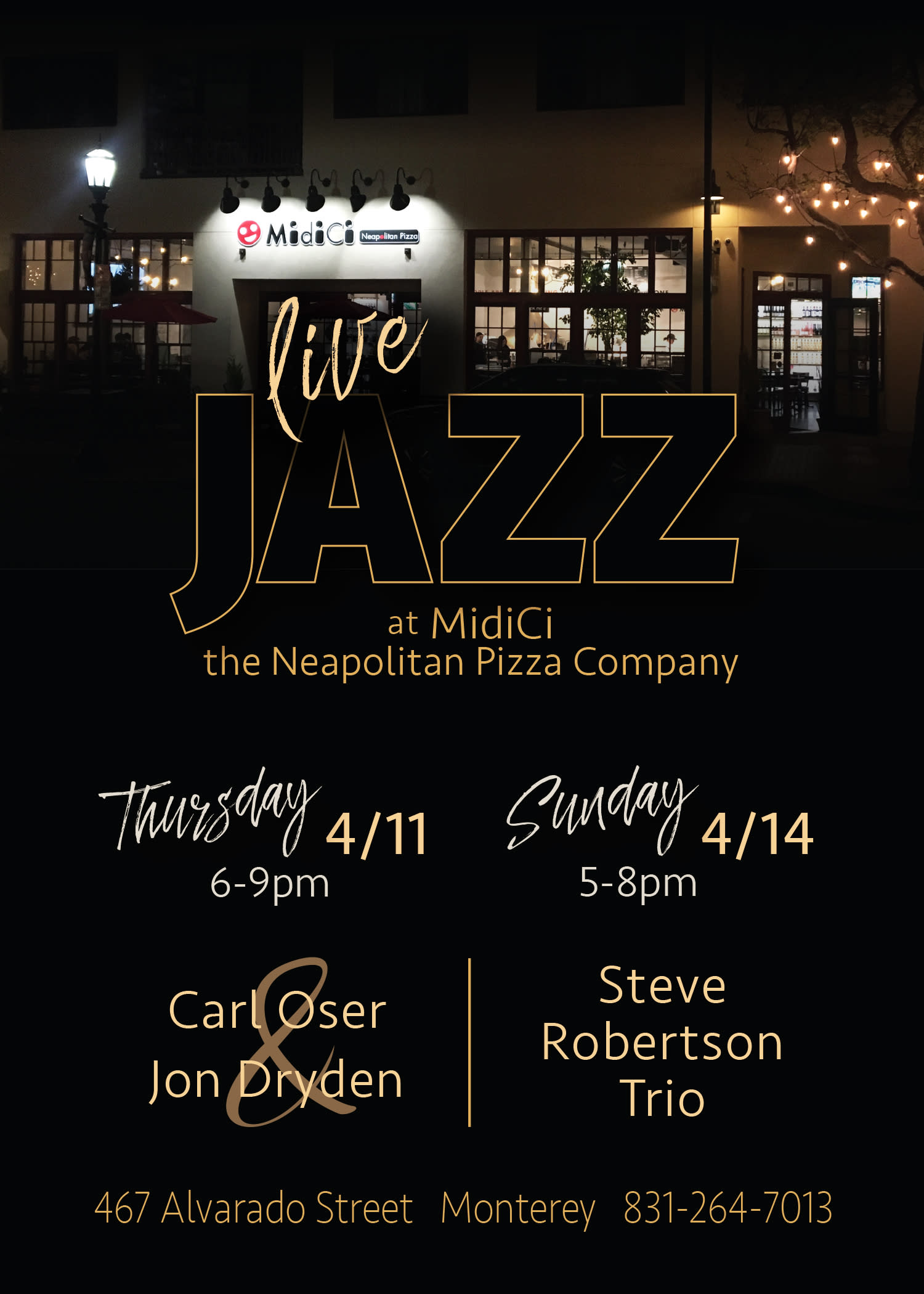 Jazz is abloom at MidiCi Monterey this spring!!! Stop by this Sunday, April 14th from 5:00 – 8:00 pm for funky, live music with the Steve Robertson Trio. Enjoy enticing food and drinks. For more information: MidiCi