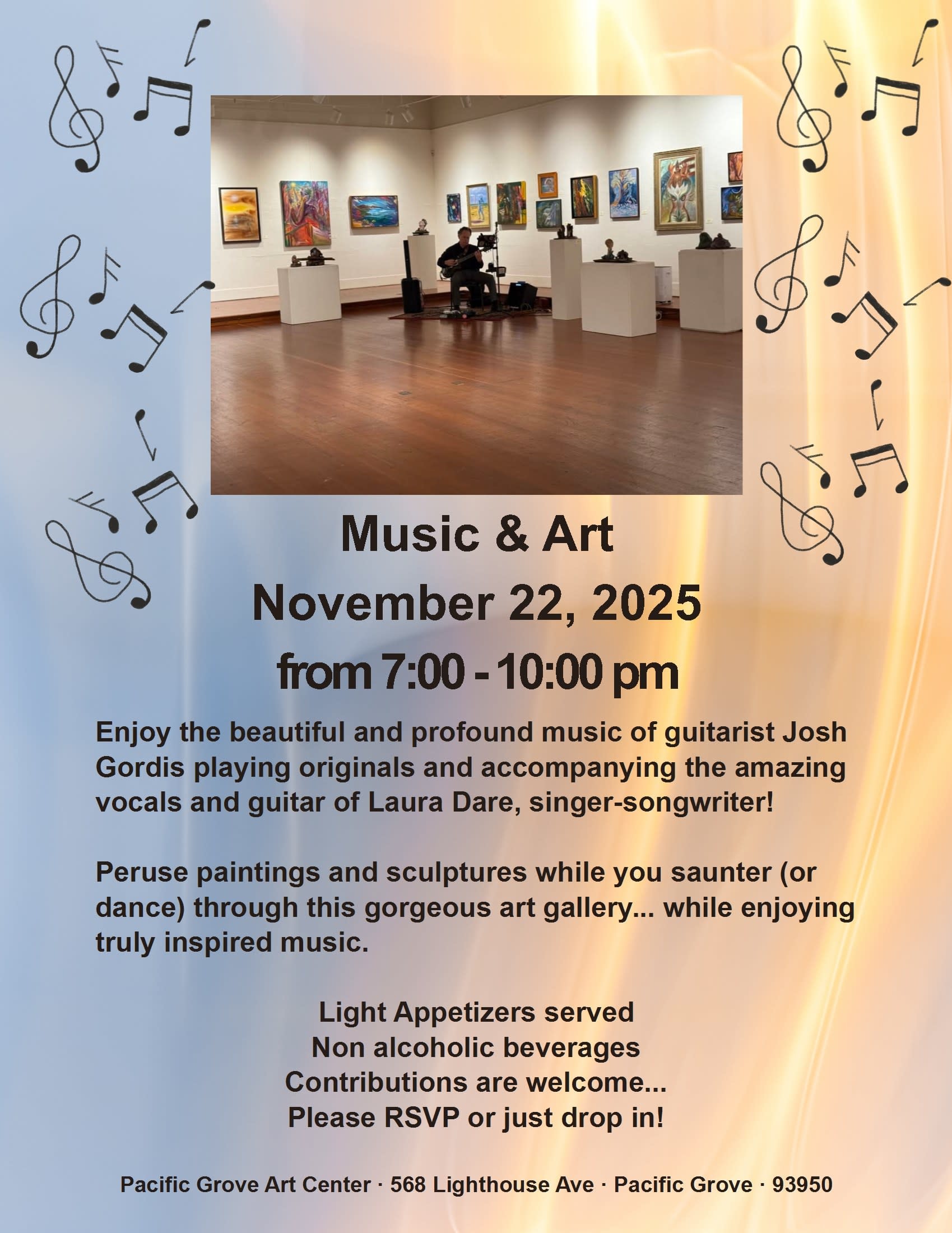 On Saturday, November 22nd from 7:00 - 10:00 pm, enjoy the beautiful and profound music of guitarist Josh Gordis playing originals and accompanying the amazing vocals and guitar of Laura Dare, singer-songwriter! Peruse paintings and sculptures while you saunter (or dance) through this gorgeous art gallery, while enjoying truly inspired music.