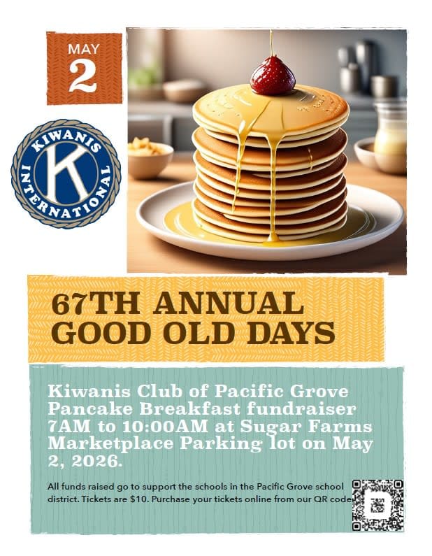 The Pancake Breakfast Fundraiser will be on Saturday, May 2nd from 7:00 - 10:00 am in the Sugar Farms Marketplace parking lot. All funds will go to support the schools in the Pacific Grove school district. Tickets are $10.00. Purchase your tickets at Kiwanis