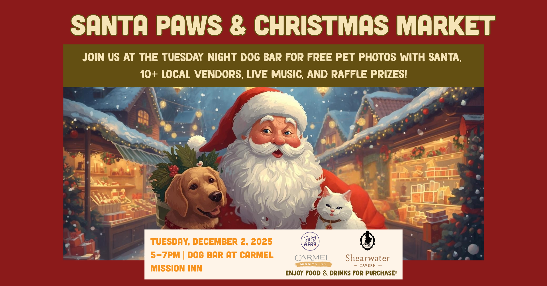Shop for holiday gifts with artisan vendors with bath & body products, gourmet nuts, candy and dog treats! Jewelry, clothing, stationary, and more! Bring the whole family & enjoy the fire-pits, live music and pet pics with Santa! Support AFRP by purchasing $5.00 raffle tickets for amazing prizes, like an overnight stay at Carmel Mission Inn!